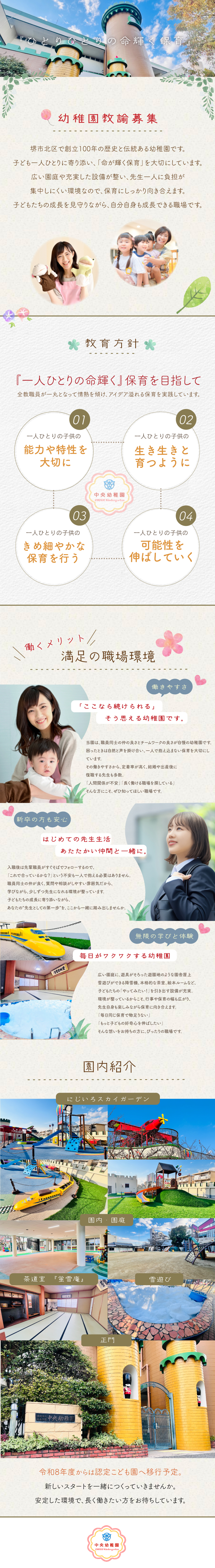 <幼稚園教諭・保育教諭/2026年3月に卒業予定の方(新卒(短大・専門卒)の方)>【堺市北区/幼稚園教諭】4月入社OK!新金岡エリアの幼稚園/年休135日◎賞与4ヶ月/土日祝休みの正社員を募集中!当園の魅力は、何よりも職場の雰囲気の良さ。若手から中高年まで幅広い世代が活躍しており、困った時は先輩がしっかりフォローします。見学だけでも大歓迎。安心して長く働ける環境です。