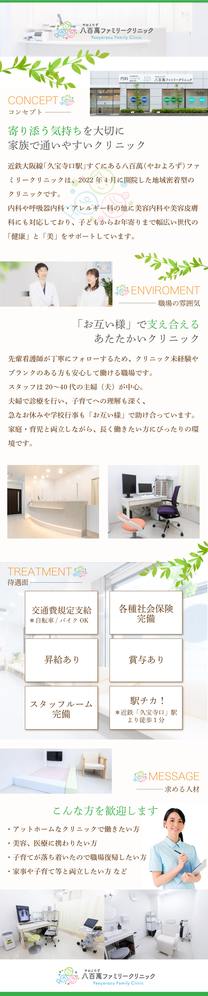 | おすすめポイント | スタッフは20〜40代の主婦(夫)さんが多く活躍中。 夫婦で診療しているクリニックで、子育てへの理解もあり、急なお休みや学校行事にも柔軟に対応。 家庭・育児と両立しながら安心して働ける職場です。 駅近、アクセス良好!近鉄「久宝寺口駅」より徒歩1分! 明るい対応ができる方歓迎します! 内科・美容内科を間近で学べる、新しい綺麗な施設で働きませんか? |