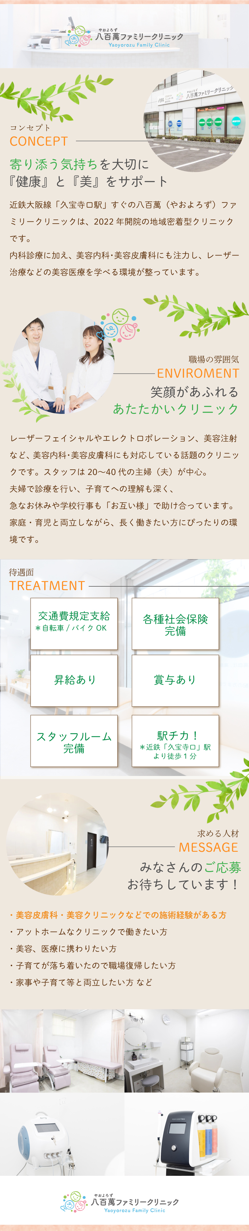| おすすめポイント | スタッフは20〜40代の主婦(夫)さんが多く活躍中。 夫婦で診療しているクリニックで、子育てへの理解もあり、急なお休みや学校行事にも柔軟に対応。 家庭・育児と両立しながら安心して働ける職場です。 駅近、アクセス良好!近鉄「久宝寺口駅」より徒歩1分! 明るい対応ができる方歓迎します! 内科・美容内科を間近で学べる、新しい綺麗な施設で働きませんか? |